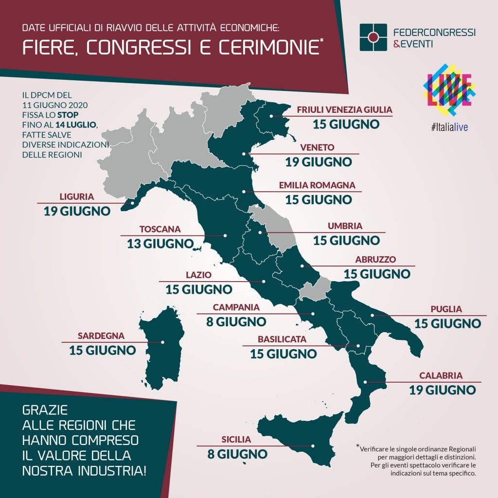 Queste le 14 regioni nelle quali è già possibile realizzare congressi ed eventi, con le date di riapertura: