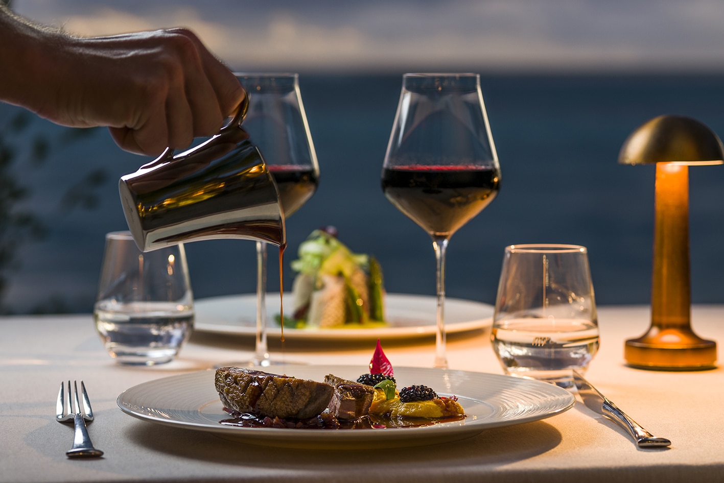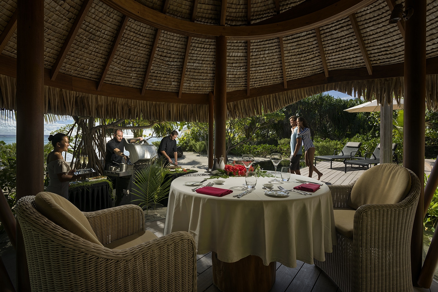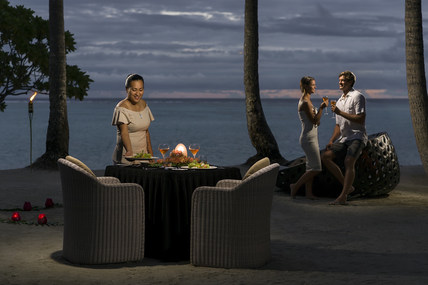 Alla sera, niente di meglio che una cena romantica a lume di candela sulla spiaggia o al coperto con vista incantevole sulla laguna e sull’oceano Pacifico. Oppure un tavolo privato con lo chef giapponese per uno show cooking. Anche se …è privato anche il pranzo in un’area comune riservatissima!