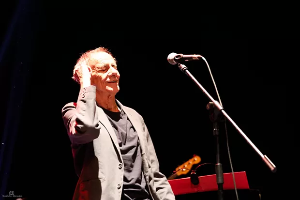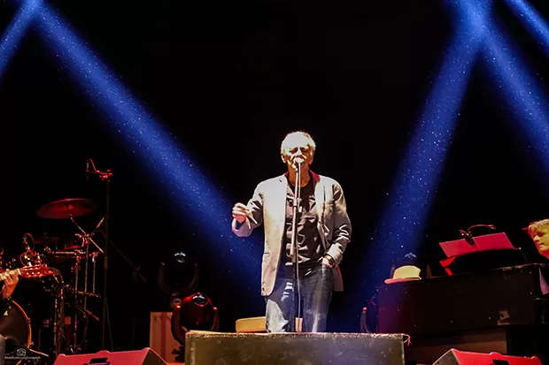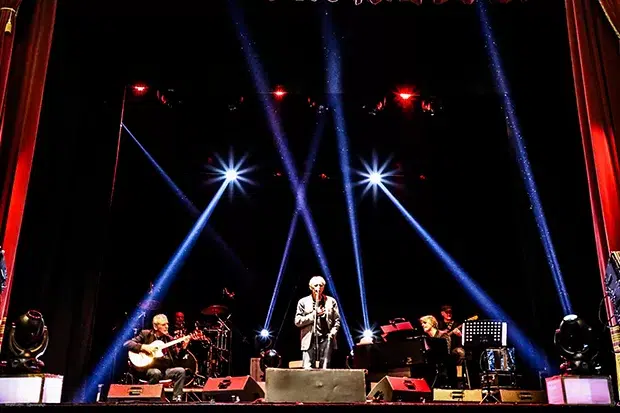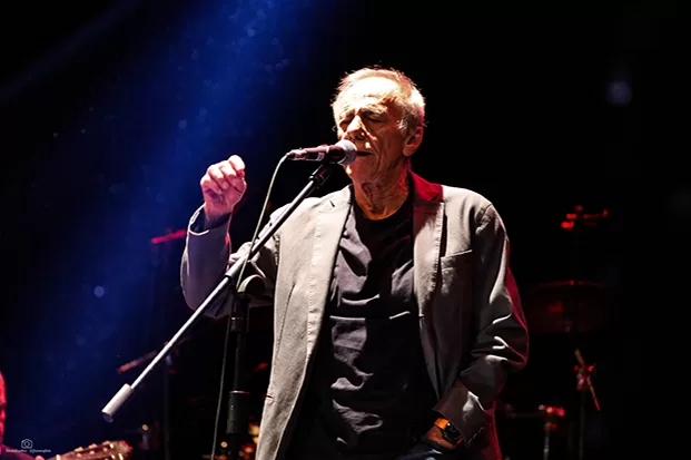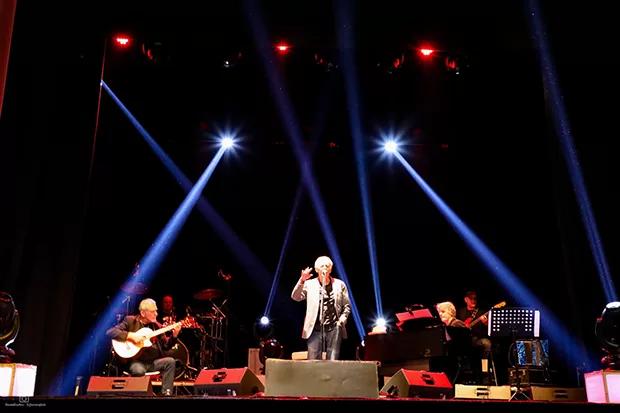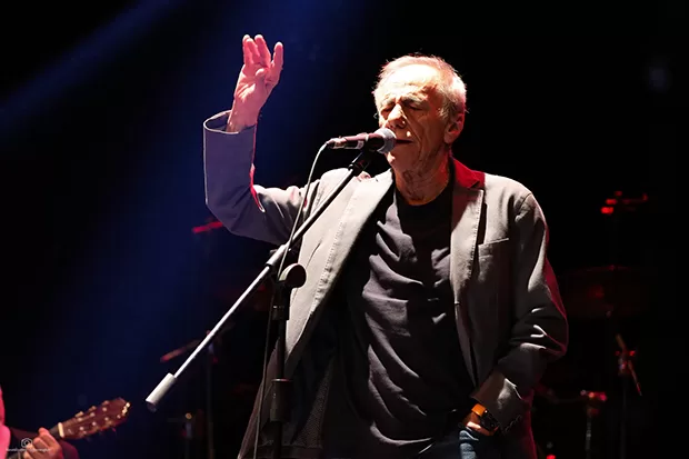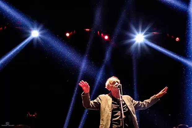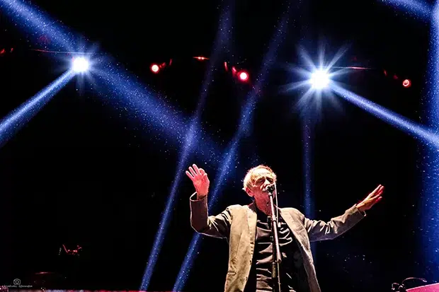 Con la sua band storica, i suoi amici di sempre, illuminato da spot che tracciavano scie verso il soffitto e parevano indicare una strada verso le stelle di amori perduti o vicini, ha cantato la sua storia in musica.