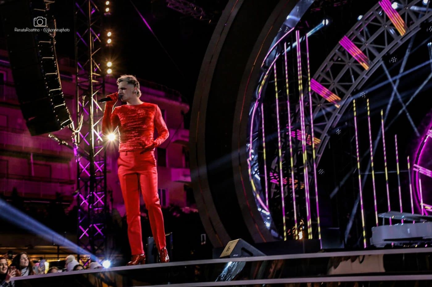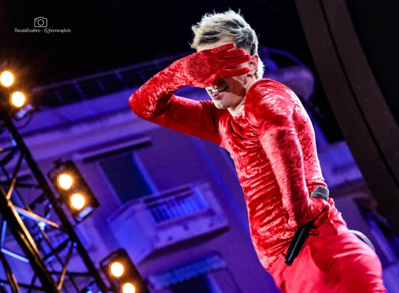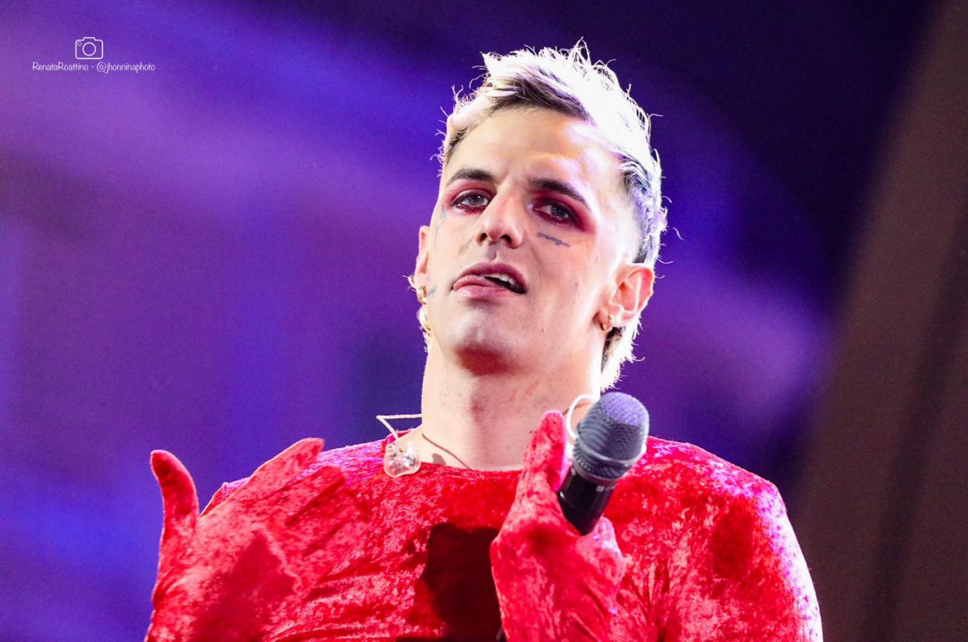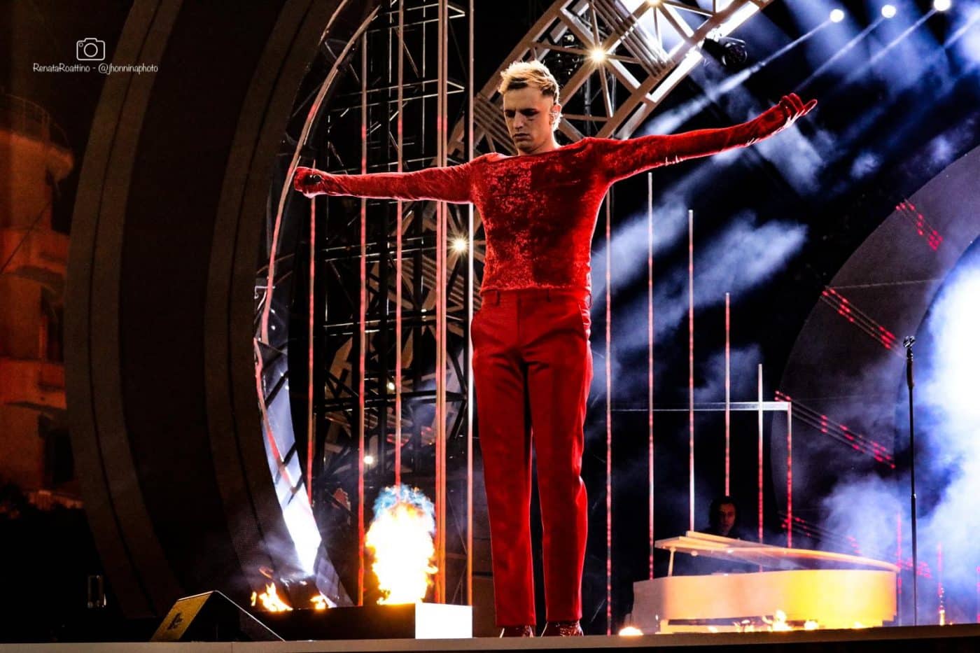Il mini live di Achille Lauro non ha deluso i fans. Ospite finale della rassegna Tra palco e città, fortemente voluta da Rai pubblicità e dall’amministrazione comunale, Lauro è salito sul palco come un diavolo rosso dagli occhi iniettati di sangue. Inguainato in maglia-pantaloni-guanti rosso vivo che quasi non lo distingueva dal fondale e dalle luci rendendolo parte vivente della scenografia e forte di una band che lo ha supportato con una ritmica incalzante, il cantante ha mantenuto fede alla sua fama di camaleonte del palco.