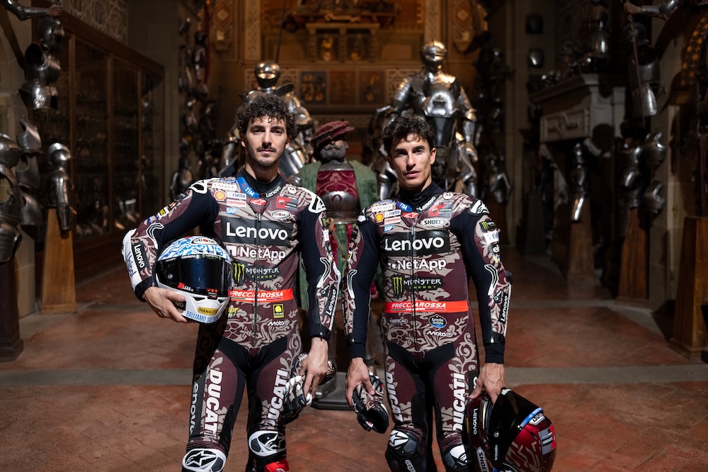 Giocando su questa doppia dimensione, i due piloti di Ducati, Pecco Bagnaia e Marc Marquez, personificano il moderno cavaliere e salgono sui loro destrieri per scendere in battaglia. Anche i loro numeri di gara, 63 e 93, diventano marchi a fuoco sul ferro della loro nuova armatura.