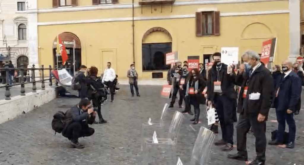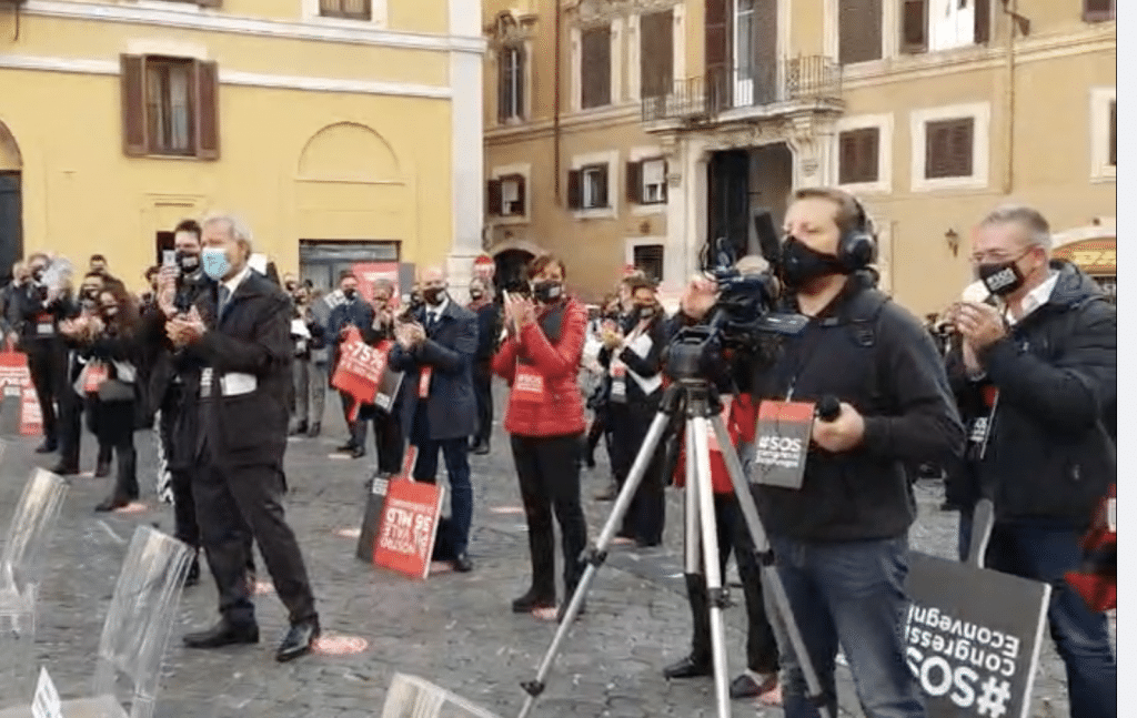 Il mondo degli eventi ha messo 6 sedie per far sedere il mondo delle istituzioni, per Di Maio, per Gualtieri, per Conte, cui si chiede attenzione. Un mondo che voleva riprodurre in piazza una sala congressi, che voleva poter portare sedie per tutti. Non lo hanno concesso. Il Convention Bureau Italia ha detto “stiamo raschiando il fondo; se questo settore non viene considerato siamo destinati alla morte.”