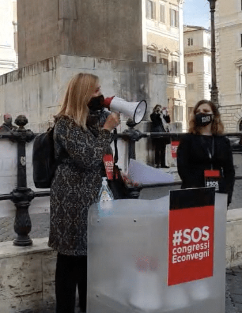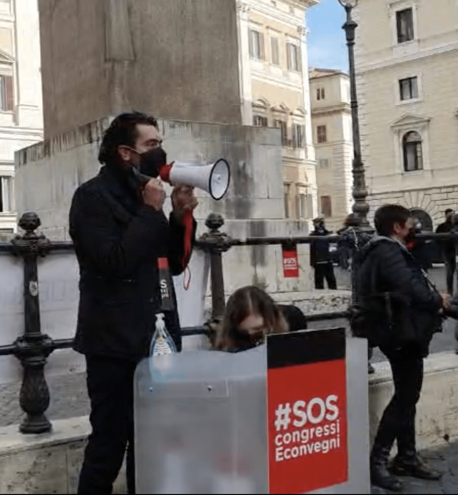 La manifestazione sta dimostrando che il mondo degli eventi è responsabile, non fa correre rischi. È una manifestazione educata, dignitosa, rispettosa delle norme con gel e disinfettanti, con megafoni che vengono cambiati per ogni oratore. Perché il settore vuole dimostrare che per primo, sa convivere con il virus, sa accettare le nuove regole. E chiede di poter fare il lavoro per cui 570.000 addetti hanno studiato. Da Roma #soscongressieconvegni