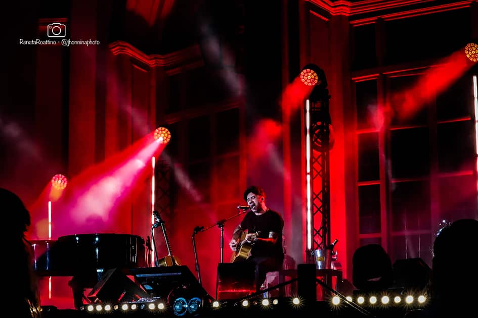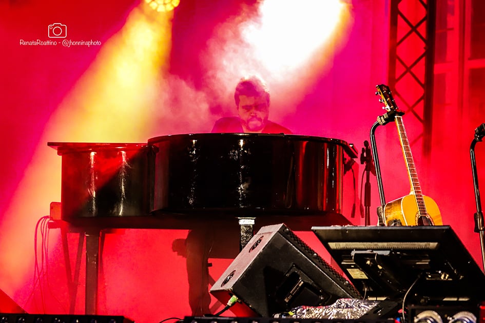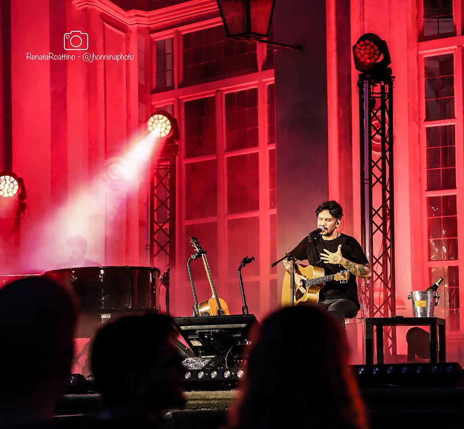 L’idea guida era quella di portare sul palco la sua stanza. Una bottiglia di buon vino con cui bere alla salute insieme ad amici che aspettavano l’incontro da tempo. Pochi strumenti, quasi un unplugged. Il resto lo ha fatto una serata magica che illuminava di rosso e blu lo Stupinigi Sonic Park. Un concerto acustico emoziante e coinvolgente.