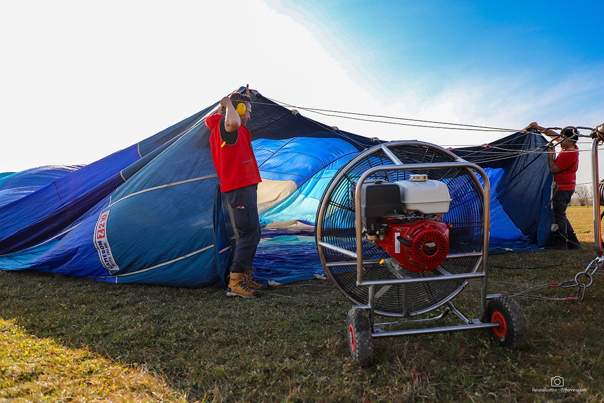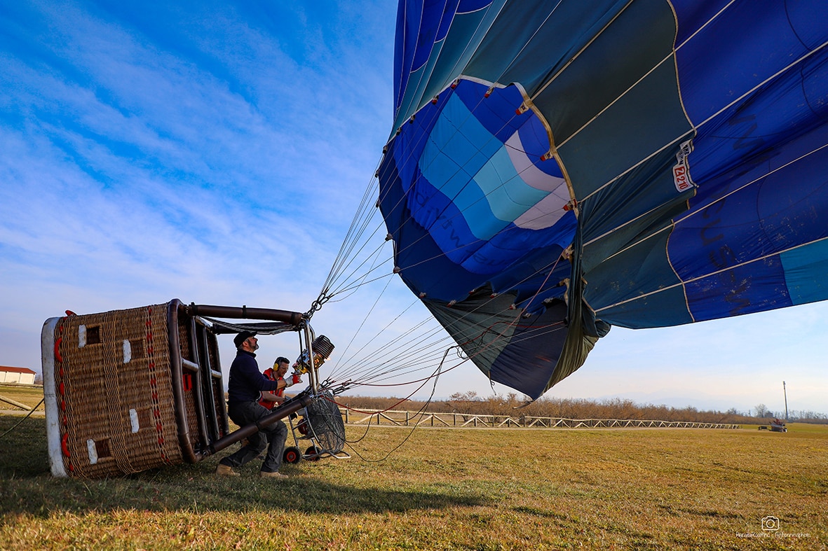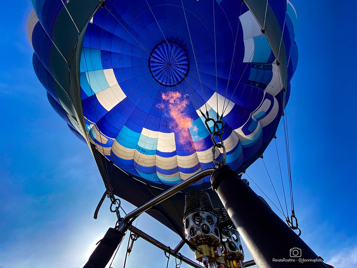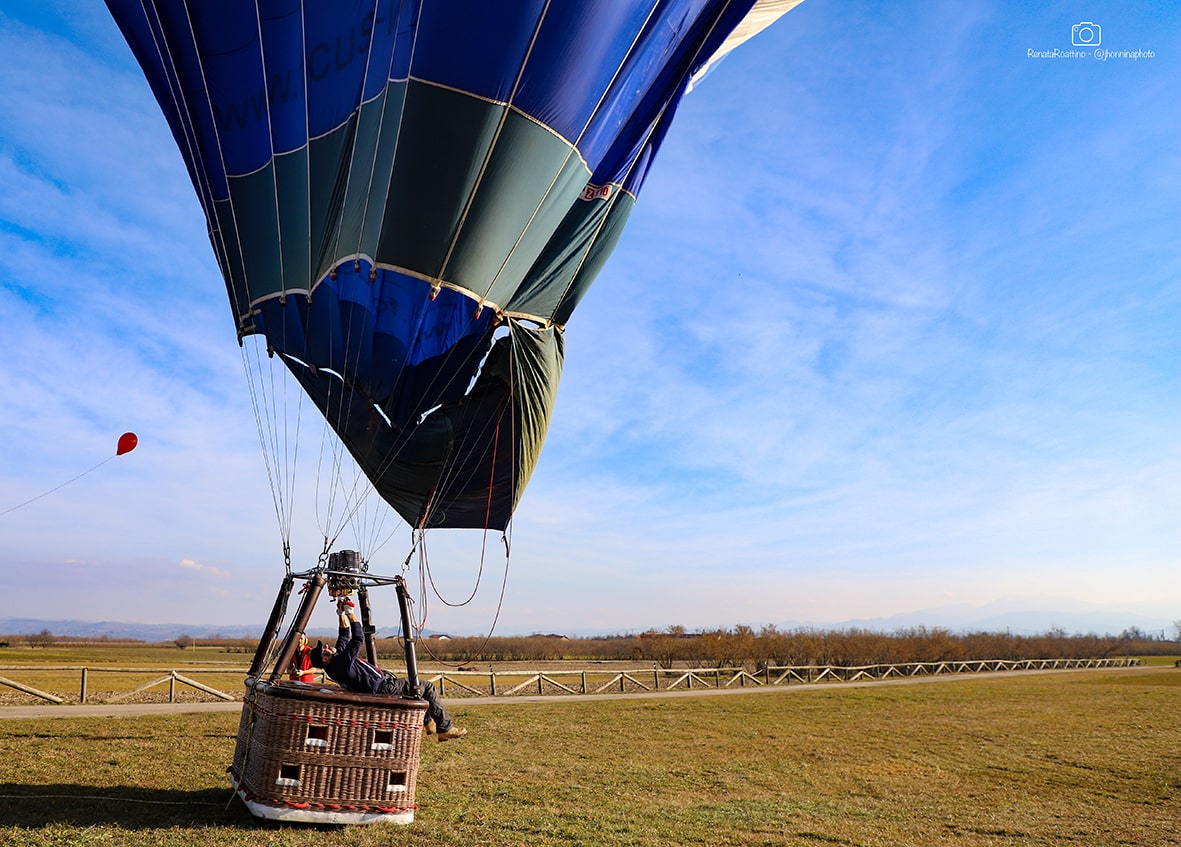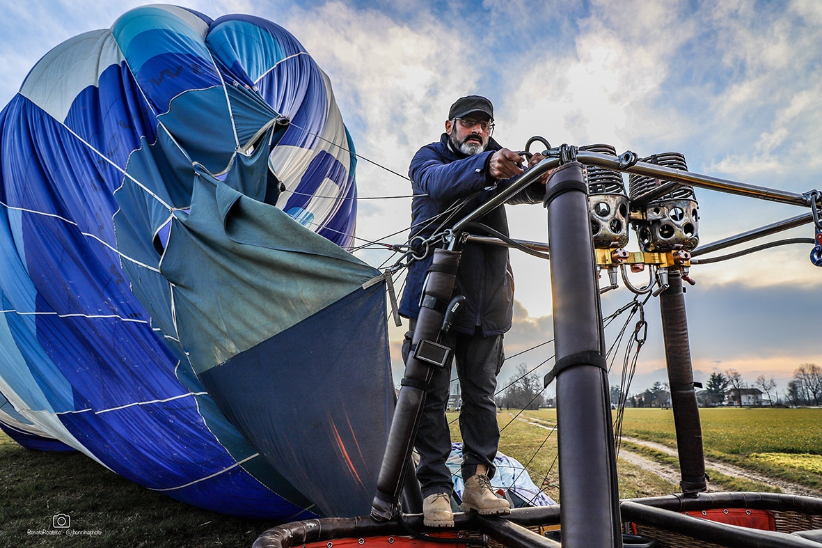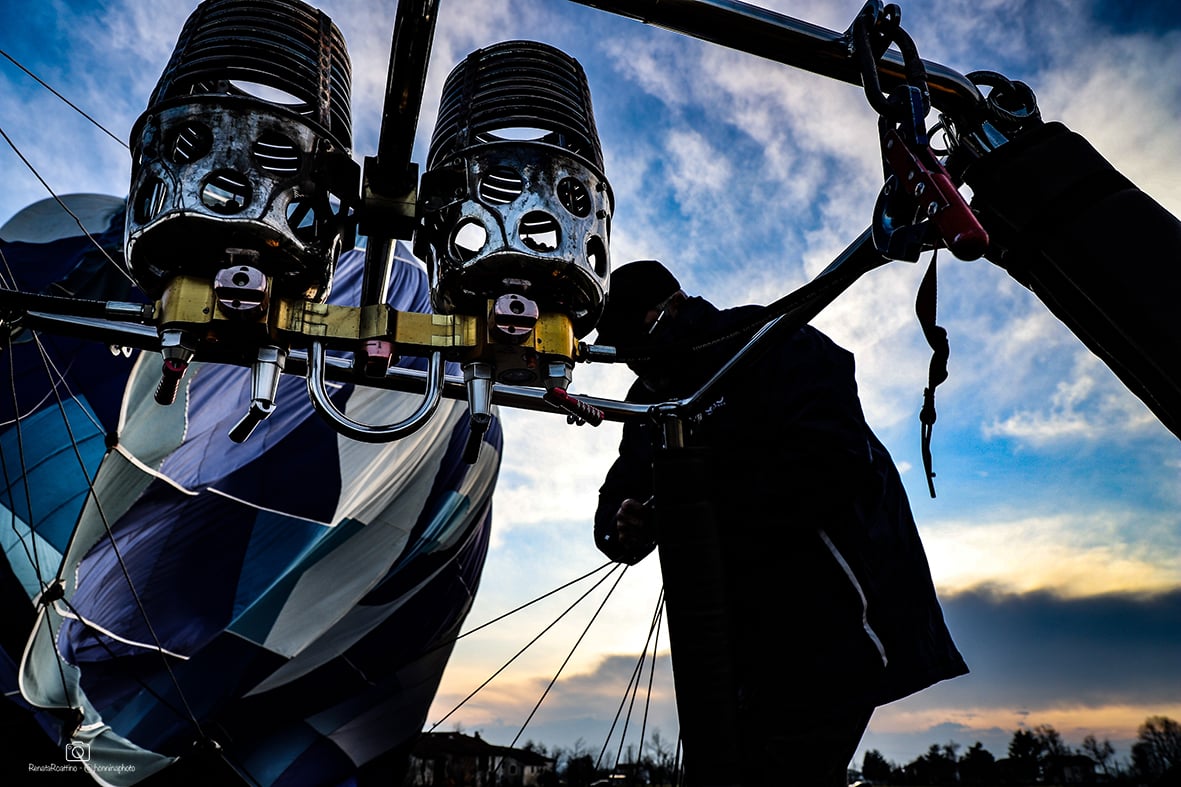 Tutto comincia su un campo. Le mongolfiere ancora non si vedono. Sono distese a terra mentre le funi vengono controllate e tesate, mentre i bruciatori vengono prima collegati e poi accesi, i pesi legati perché per sbaglio nessun cestello si alzi senza un pilota a bordo, i ventilatori girano e le pale pompano l’aria facendo gonfiare i palloni che presto prenderanno il volo. L’attività è febbrile perché tutto il team che porterà gli ospiti in volo ha un compito preciso, ma tutto si svolge senza fretta, senza frenesia, nel rispetto di un rituale antico che si ripete ogni volta che si vola.
