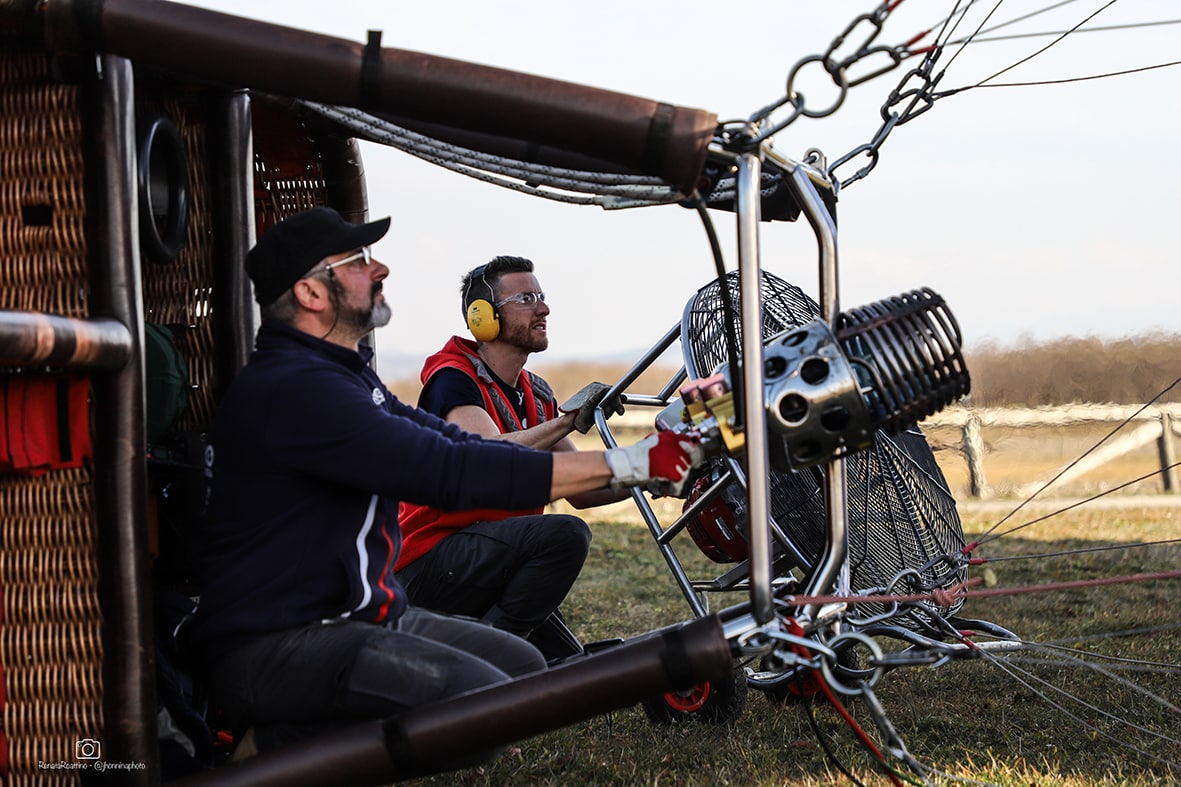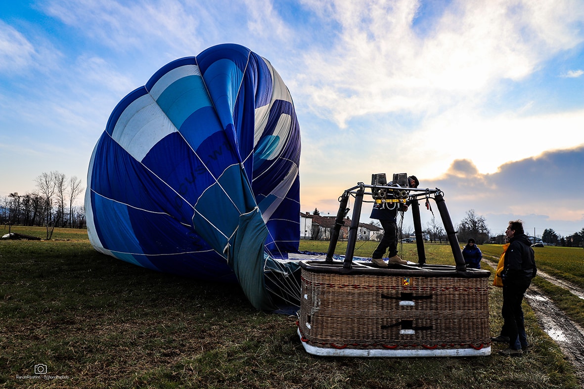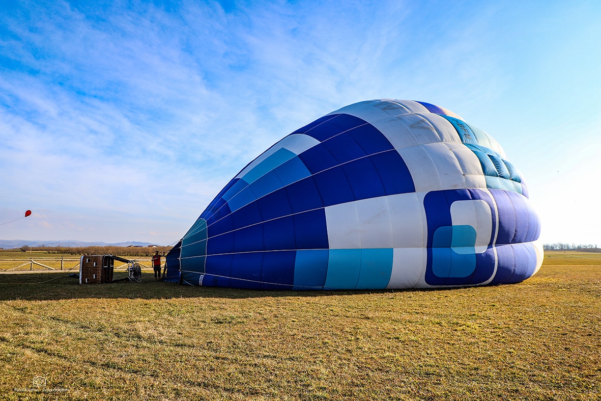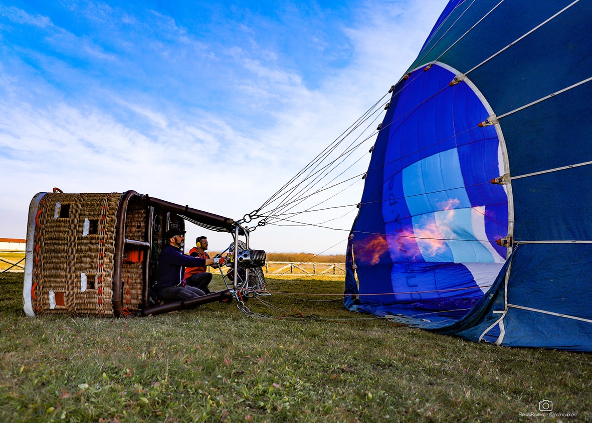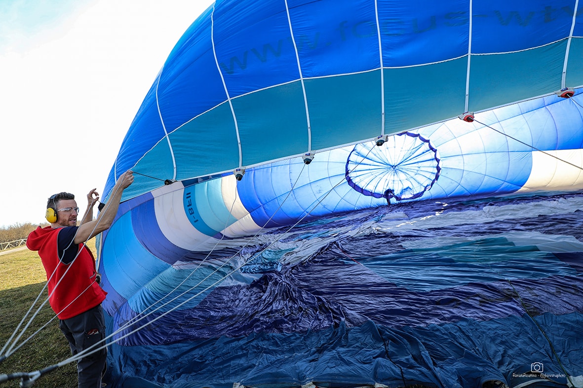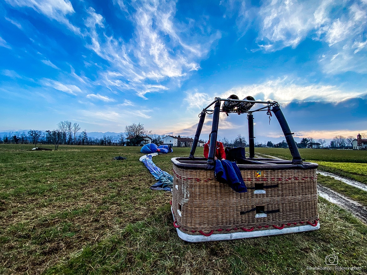 Tutto comincia su un campo. Le mongolfiere ancora non si vedono. Sono distese a terra mentre le funi vengono controllate e tesate, mentre i bruciatori vengono prima collegati e poi accesi, i pesi legati perché per sbaglio nessun cestello si alzi senza un pilota a bordo, i ventilatori girano e le pale pompano l’aria facendo gonfiare i palloni che presto prenderanno il volo. L’attività è febbrile perché tutto il team che porterà gli ospiti in volo ha un compito preciso, ma tutto si svolge senza fretta, senza frenesia, nel rispetto di un rituale antico che si ripete ogni volta che si vola.